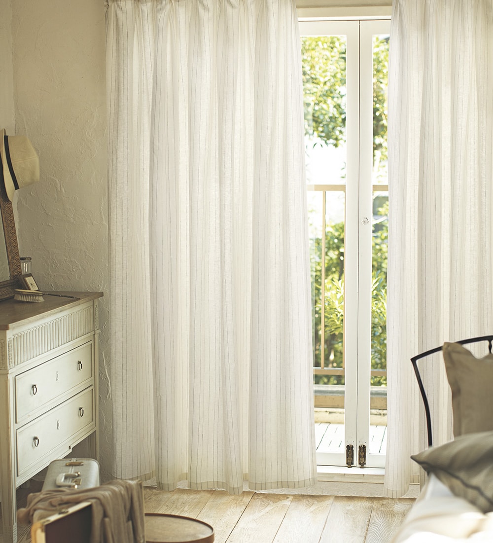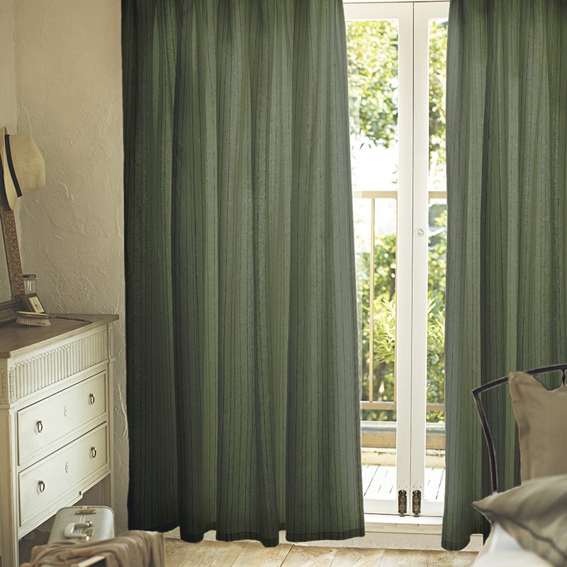 海外のインテリアでよく見られる仕上げで、リネンやコットンの表情によく似合います。また、窓からの冷気侵入を防ぎ保温効果も期待できるため、国内の寒冷地などでも採用されています。